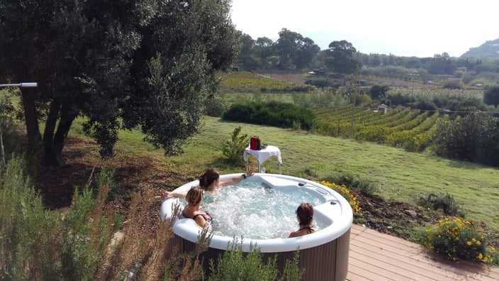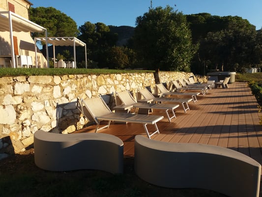 Nell'area della pedana relax puoi godere di una vista mozzafiato mentre ti rilassi nell'acqua calda della vasca idromassaggio, per poi rilassarti sui lettini al sole